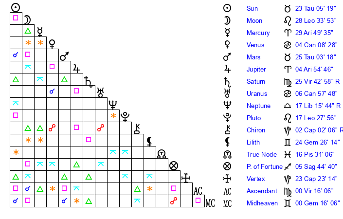 | Moon | 28 Leo 27 | 16 Sagittarius 18 | 25 Taurus 28 |