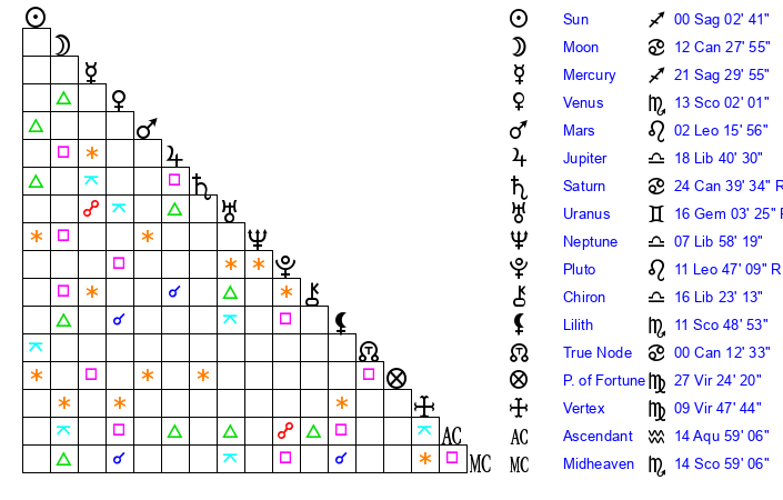 | Moon | 12 Cancer 19 | 27 Sagittarius 9 | 11 Gemini 25 |