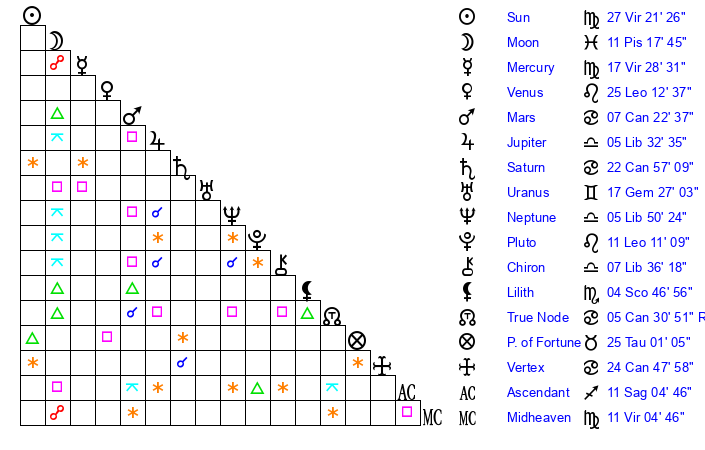 | Moon | 11 Pisces 15 | 14 Virgo 58 | 13 Aquarius 31 |