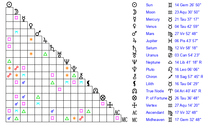 | Sun | 14 Gemini 27 | 15 Gemini 17 | 26 Leo 7 |