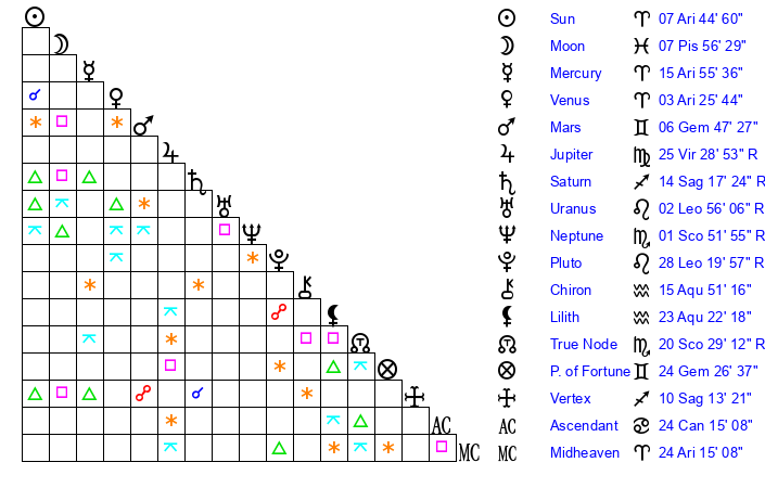 | Moon | 7 Pisces 52 | 27 Pisces 47 | 6 Virgo 1 |