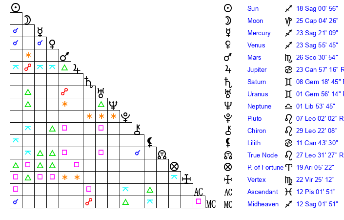 | Sun | 18 Sagittarius 1 | 18 Sagittarius 53 | 12 Pisces 15 |