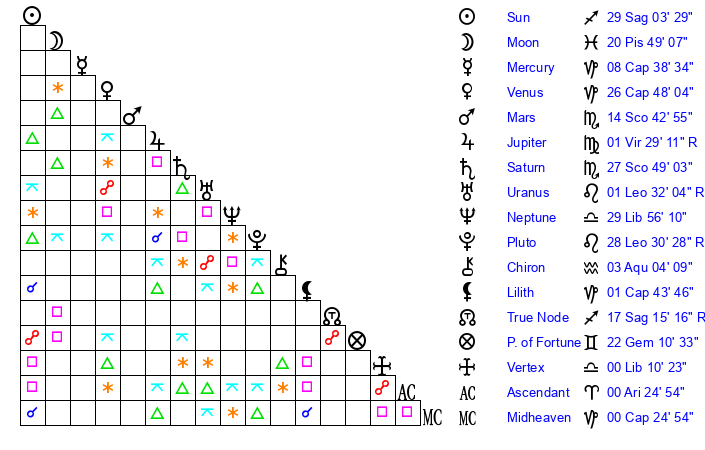 | Moon | 20 Pisces 48 | 18 Capricorn 21 | 26 Libra 51 |