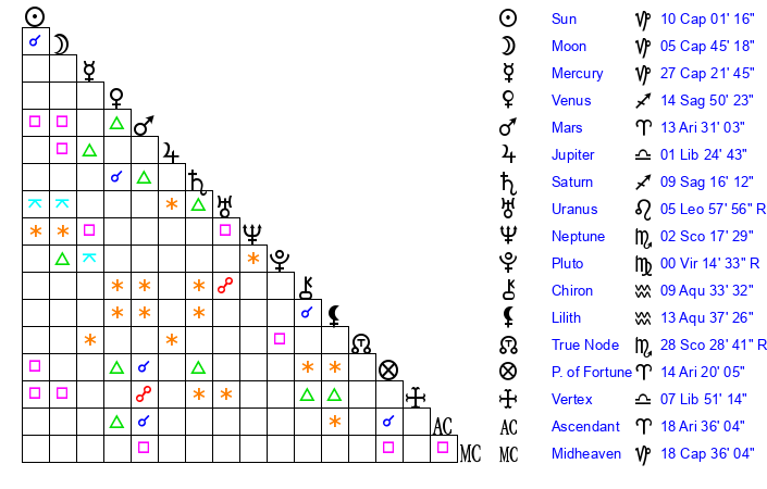 | Sun | 10 Capricorn 1 | 10 Capricorn 16 | 19 Pisces 52 |