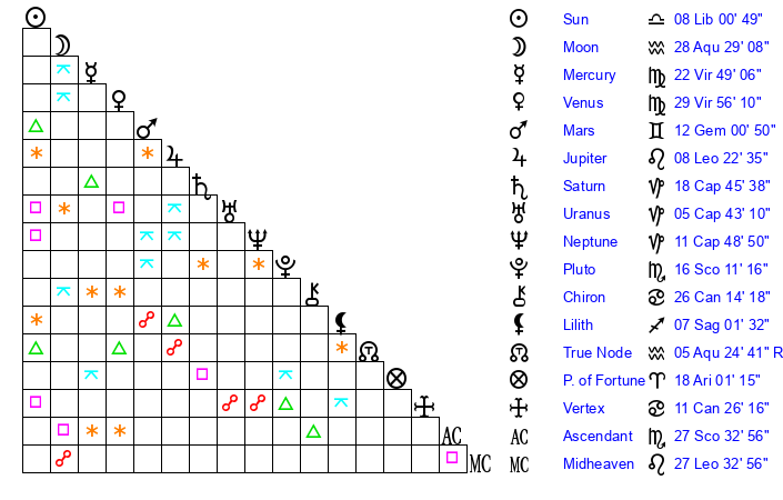 Sun | 8 Libra 0 | 8 Libra 31 | 12 Scorpio 46 |