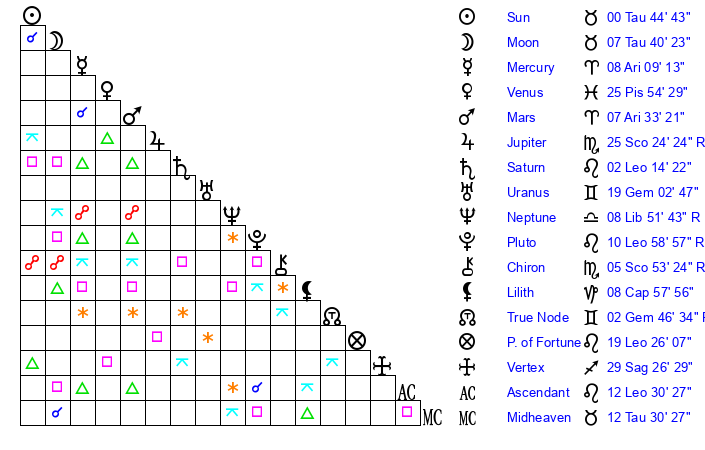 | Sun | 0 Taurus 45 | 1 Taurus 50 | 15 Cancer 41 |
