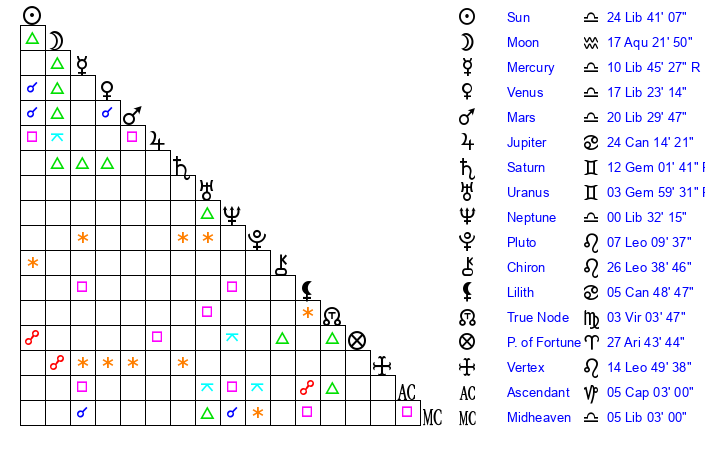 | Sun | 24 Libra 41 | 25 Libra 34 | 18 Capricorn 34 |