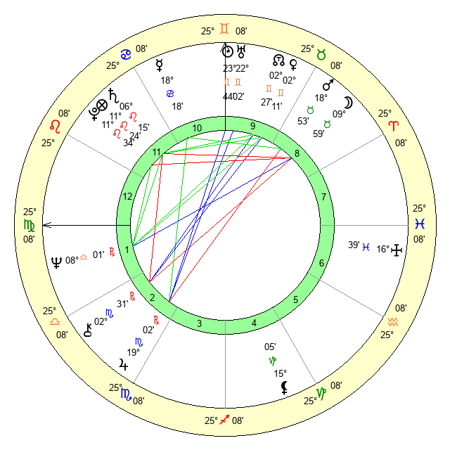 | Sun | 23 Gemini 44 | 24 Gemini 50 | 8 Virgo 24 |