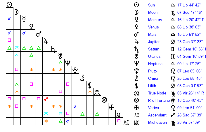 | Moon | 7 Scorpio 44 | 21 Gemini 40 | 18 Scorpio 16 |