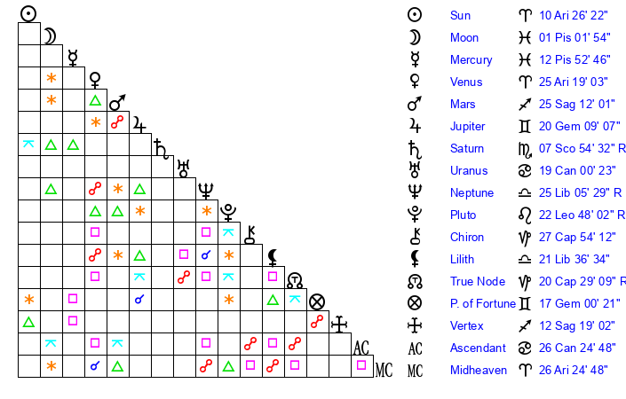 | Sun | 10 Aries 26 | 11 Aries 14 | 19 Gemini 16 |