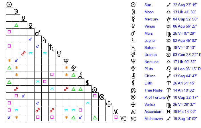 | Neptune | 17 Libra 0 | 29 Pisces 22 | 16 Libra 54 |