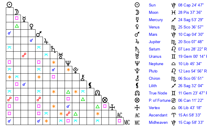 | Neptune | 10 Libra 46 | 29 Pisces 29 | 9 Libra 45 |