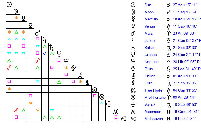 | Sun | 27 Aquarius 15 | 28 Aquarius 16 | 6 Taurus 39 |