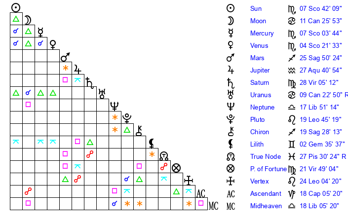 | Sun | 7 Scorpio 42 | 8 Scorpio 31 | 23 Capricorn 44 |