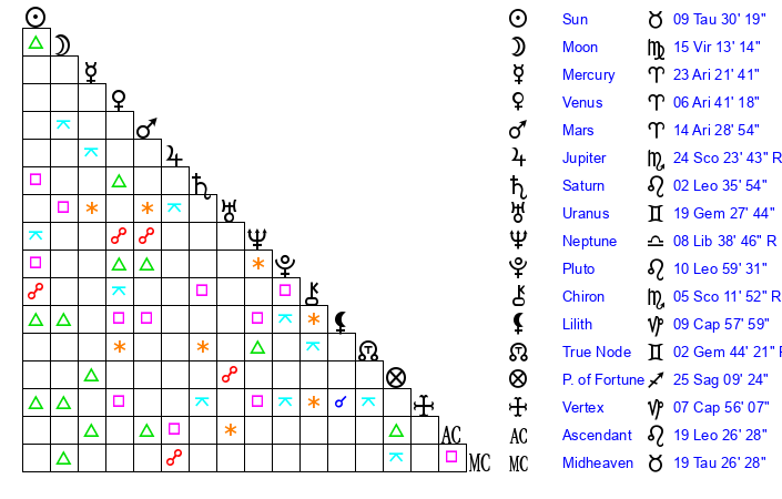 | Moon | 15 Virgo 16 | 21 Gemini 21 | 17 Cancer 34 |