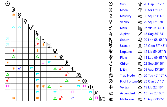 | Sun | 26 Capricorn 30 | 27 Capricorn 50 | 13 Aries 51 |