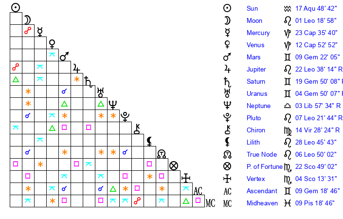 | Pluto | 7 Leo 21 | 2 Aquarius 15 | 6 Leo 25 |