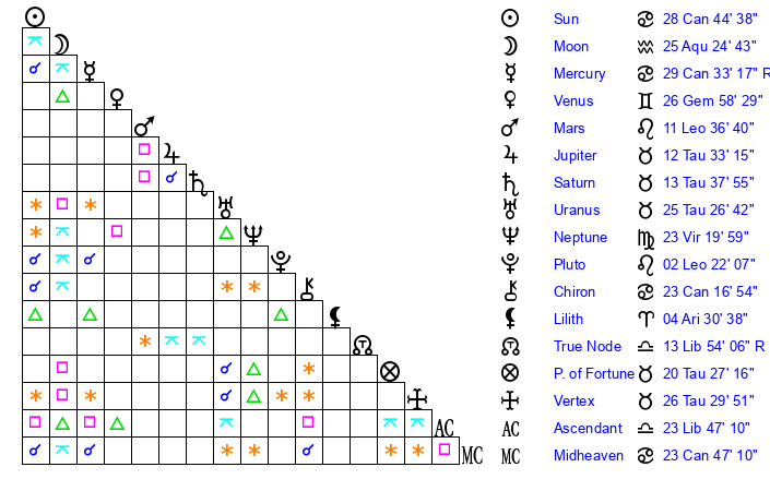 | Sun | 28 Cancer 44 | 29 Cancer 11 | 21 Libra 12 |