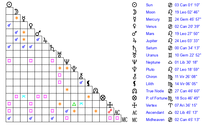| Pluto | 7 Leo 19 | 3 Aquarius 15 | 9 Leo 32 |
