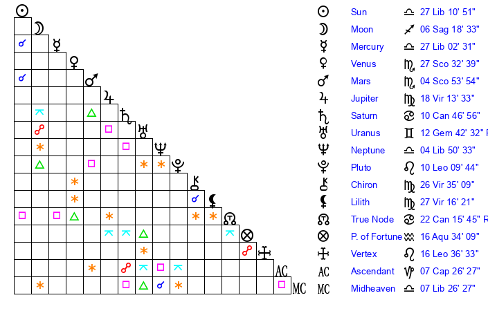 | Sun | 27 Libra 11 | 27 Libra 33 | 19 Capricorn 6 |