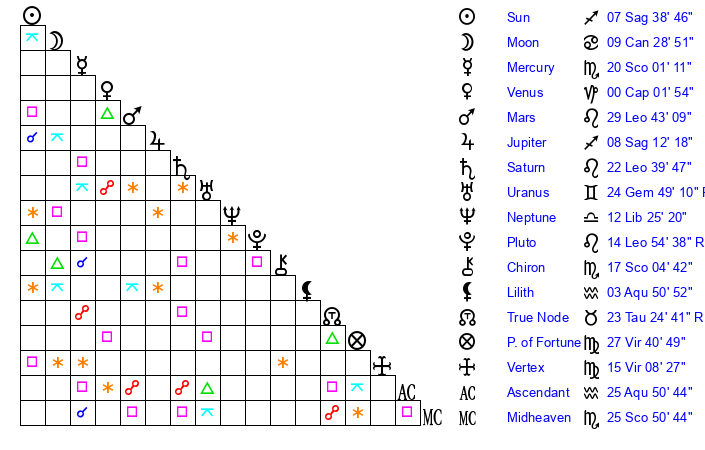 | Jupiter | 8 Sagittarius 7 | 24 Cancer 34 | 23 Sagittarius 55 |