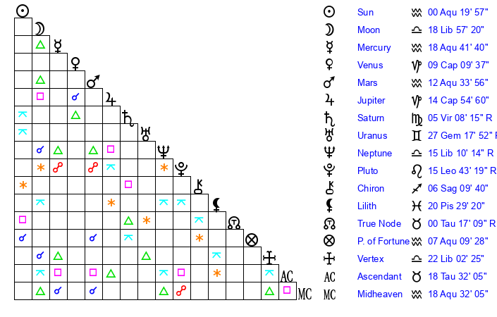| Neptune | 15 Libra 10 | 27 Pisces 40 | 13 Libra 43 |