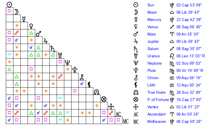 | Venus | 6 Sagittarius 7 | 0 Capricorn 2 | 2 Pisces 18 |