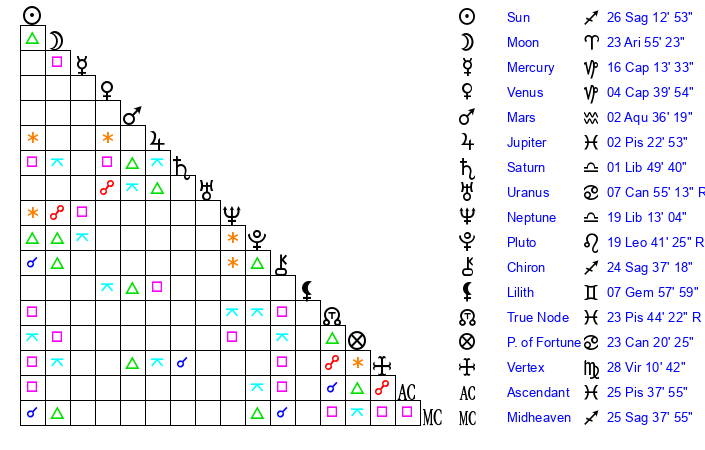 | Moon | 23 Aries 56 | 12 Sagittarius 4 | 18 Capricorn 45 |