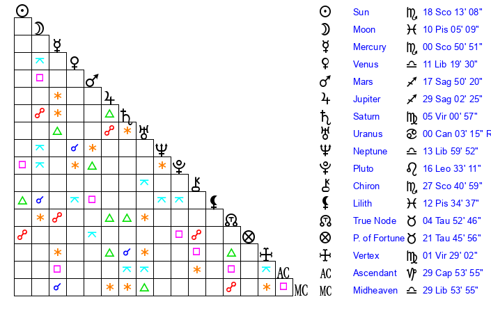 | Sun | 18 Scorpio 13 | 18 Scorpio 33 | 6 Aquarius 26 |