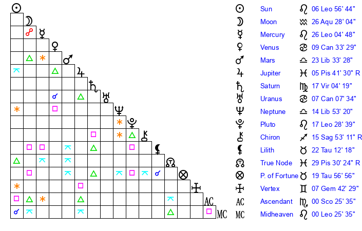 | Sun | 6 Leo 56 | 7 Leo 47 | 19 Libra 47 |