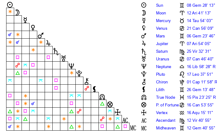 | Sun | 8 Gemini 28 | 9 Gemini 32 | 19 Leo 10 |