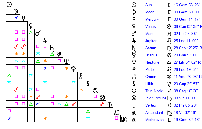 | Sun | 16 Gemini 53 | 17 Gemini 12 | 22 Leo 48 |