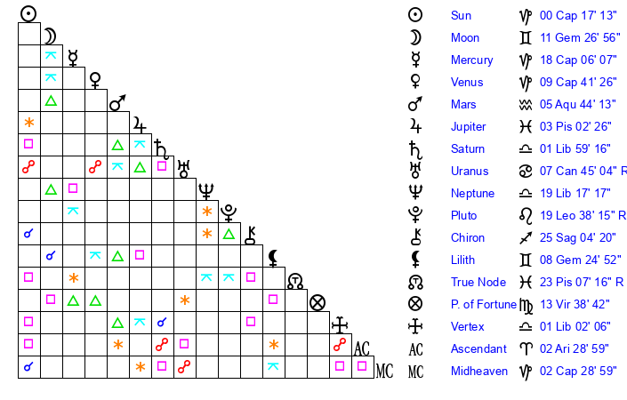 | Sun | 0 Capricorn 17 | 1 Capricorn 6 | 16 Pisces 19 |