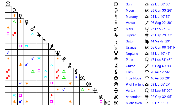 | Sun | 22 Libra 0 | 22 Libra 35 | 8 Capricorn 41 |