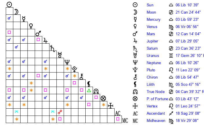 | Neptune | 6 Libra 11 | 0 Aries 34 | 8 Libra 29 |