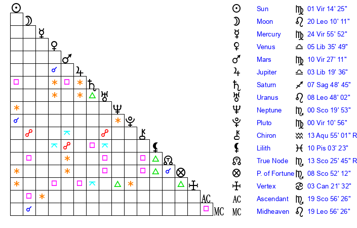 | Moon | 20 Leo 6 | 18 Virgo 54 | 22 Aquarius 3 |