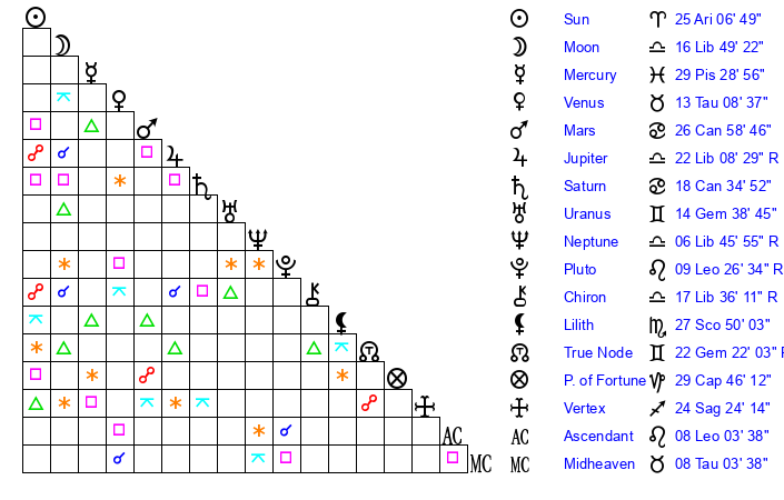 | Sun | 25 Aries 7 | 25 Aries 58 | 11 Cancer 9 |