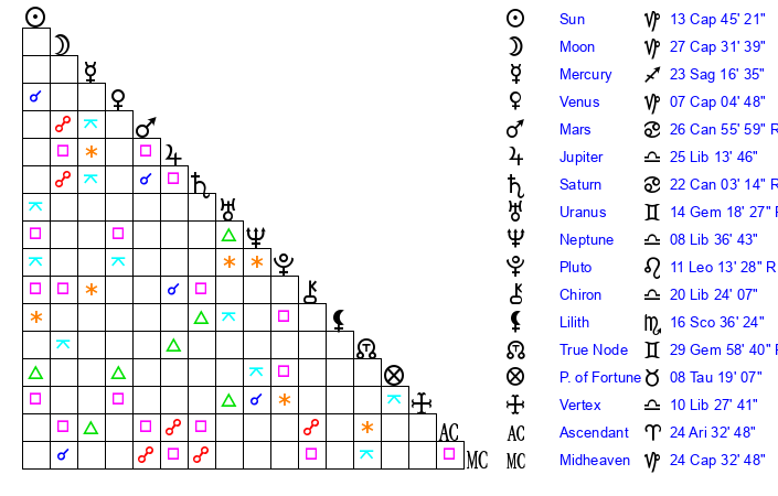 | Moon | 27 Capricorn 36 | 14 Pisces 47 | 19 Sagittarius 45 |