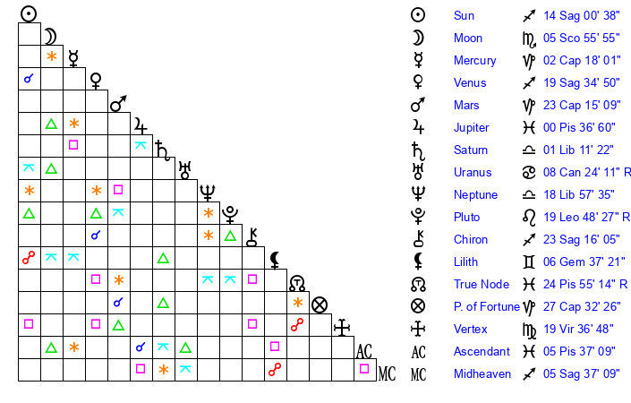 | Neptune | 18 Libra 57 | 29 Pisces 22 | 19 Libra 17 |