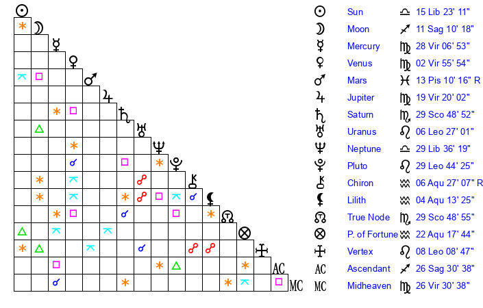 | Jupiter | 19 Virgo 12 | 23 Cancer 20 | 0 Libra 11 |