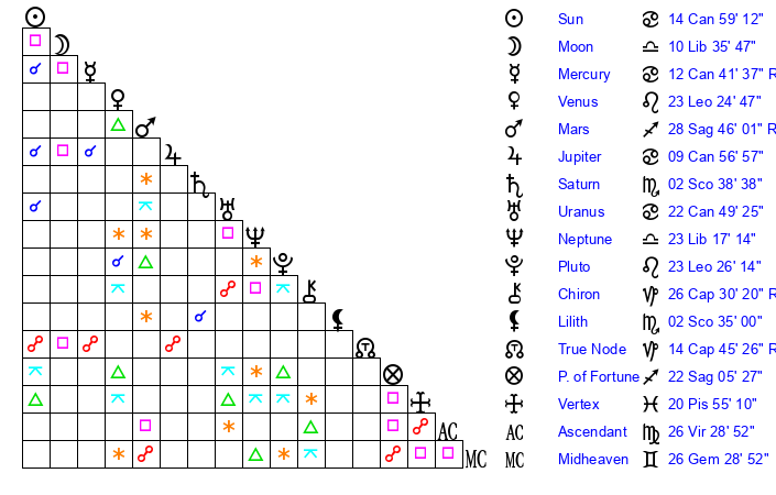 | Moon | 10 Libra 42 | 8 Sagittarius 59 | 15 Taurus 55 |