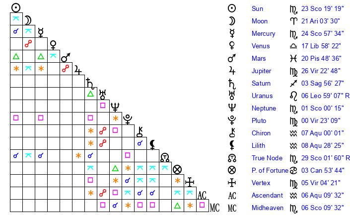 | Neptune | 1 Scorpio 0 | 29 Pisces 32 | 2 Scorpio 34 |