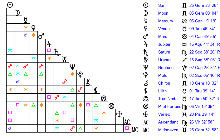 | Moon | 5 Gemini 12 | 29 Aquarius 19 | 26 Scorpio 20 |