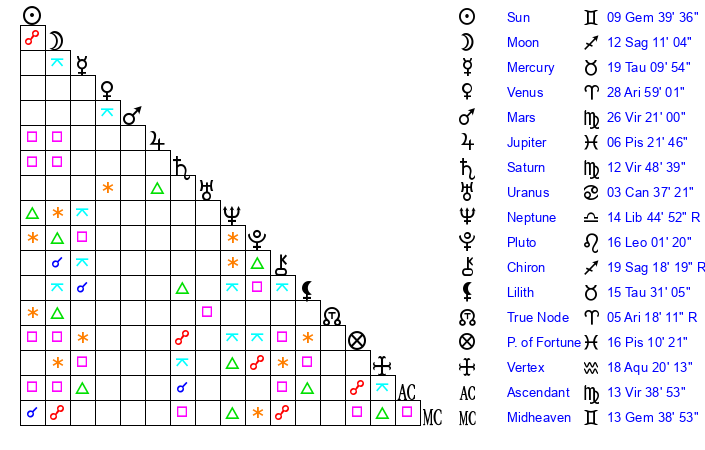 | Sun | 9 Gemini 39 | 10 Gemini 29 | 21 Leo 19 |