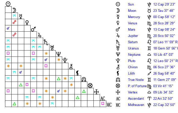 | Sun | 12 Capricorn 29 | 13 Capricorn 19 | 2 Aries 13 |
