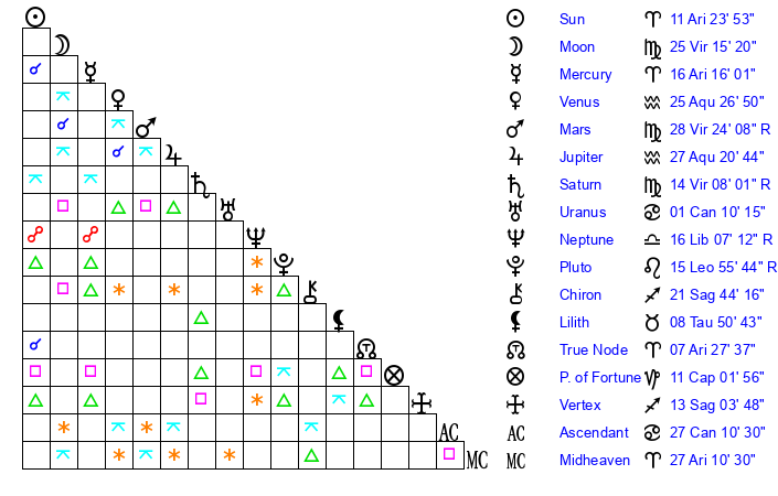 | Mars | 28 Virgo 23 | 23 Cancer 50 | 1 Libra 27 |