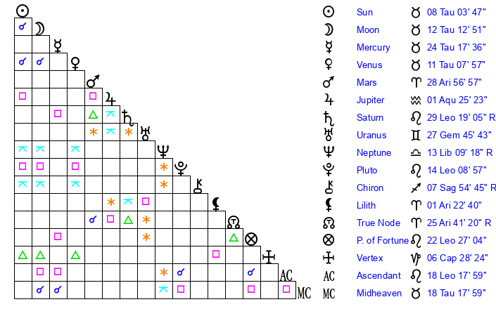 | Venus | 11 Taurus 8 | 28 Pisces 56 | 14 Leo 17 |