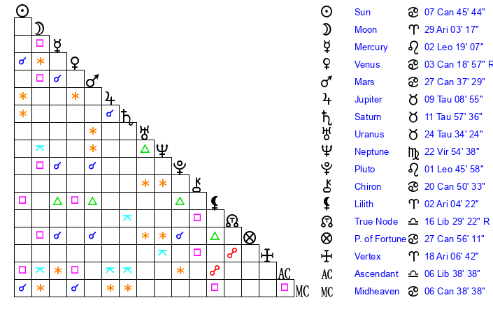 | Moon | 28 Aries 56 | 2 Virgo 54 | 5 Gemini 57 |