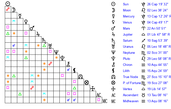 | Venus | 4 Capricorn 49 | 13 Pisces 50 | 29 Pisces 42 |