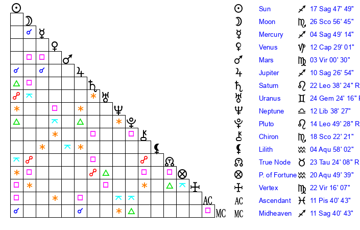 | Sun | 17 Sagittarius 48 | 18 Sagittarius 53 | 7 Pisces 1 |